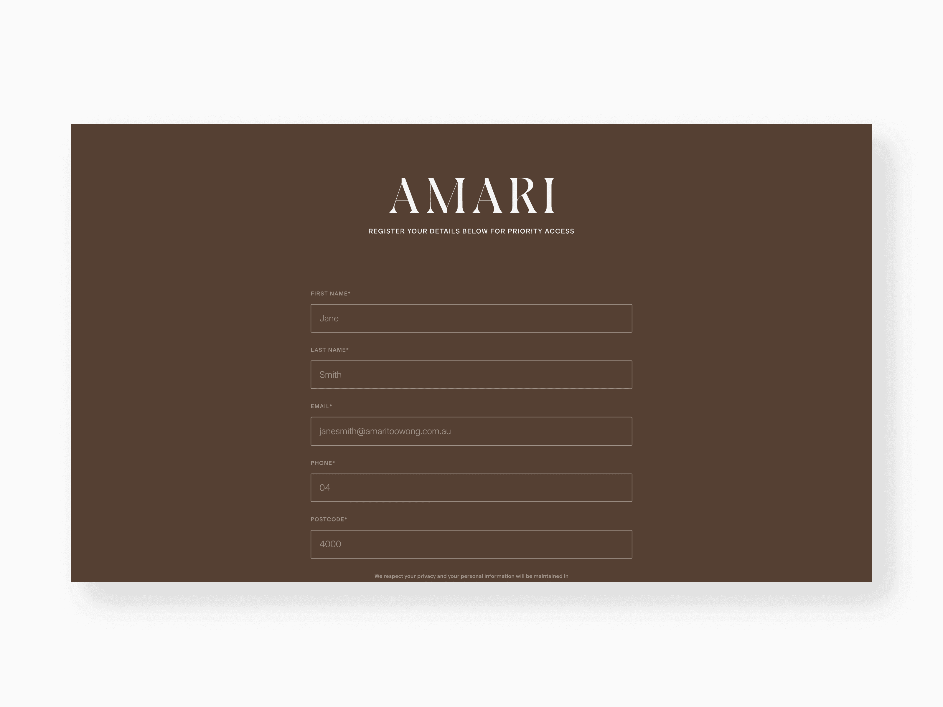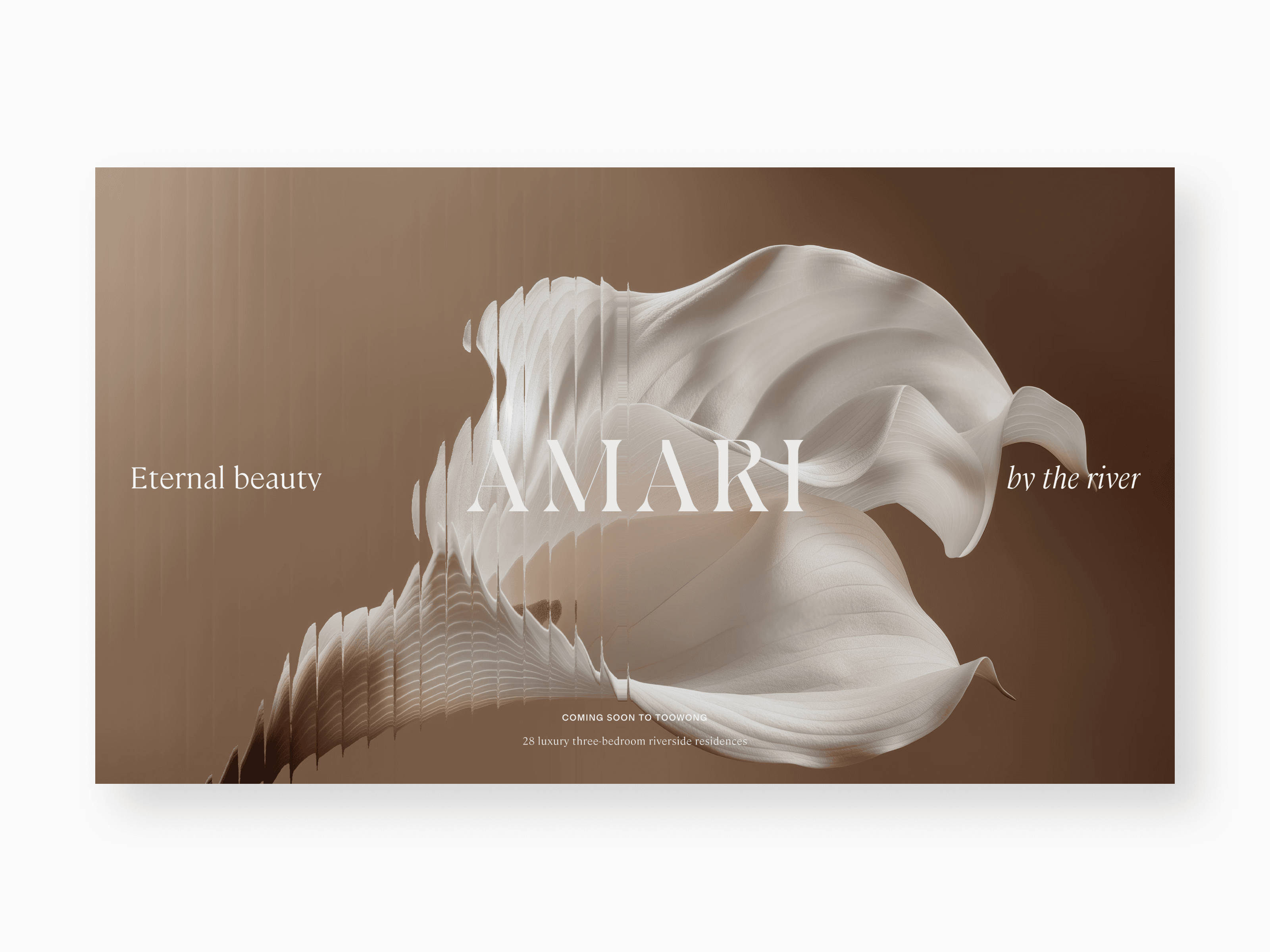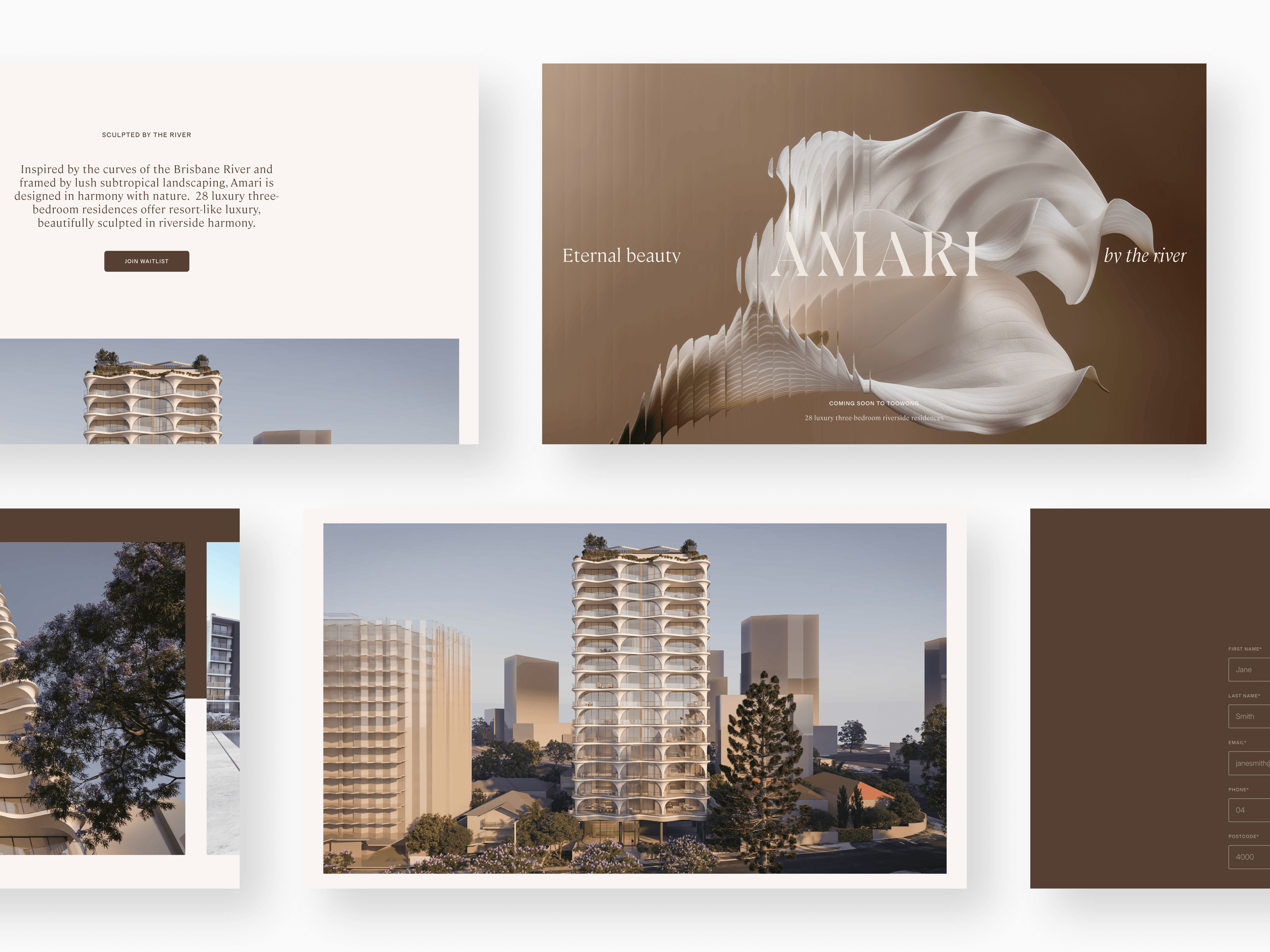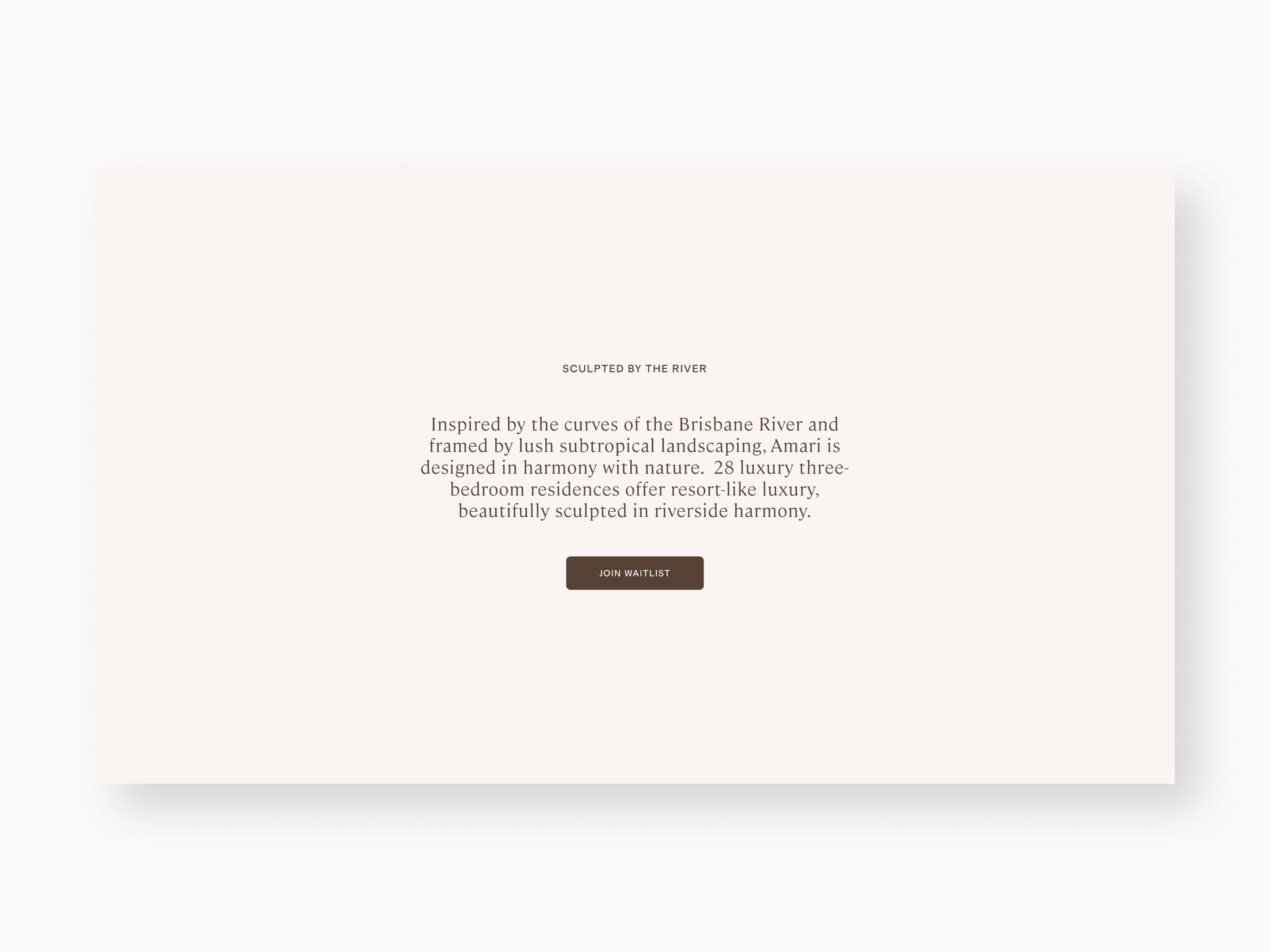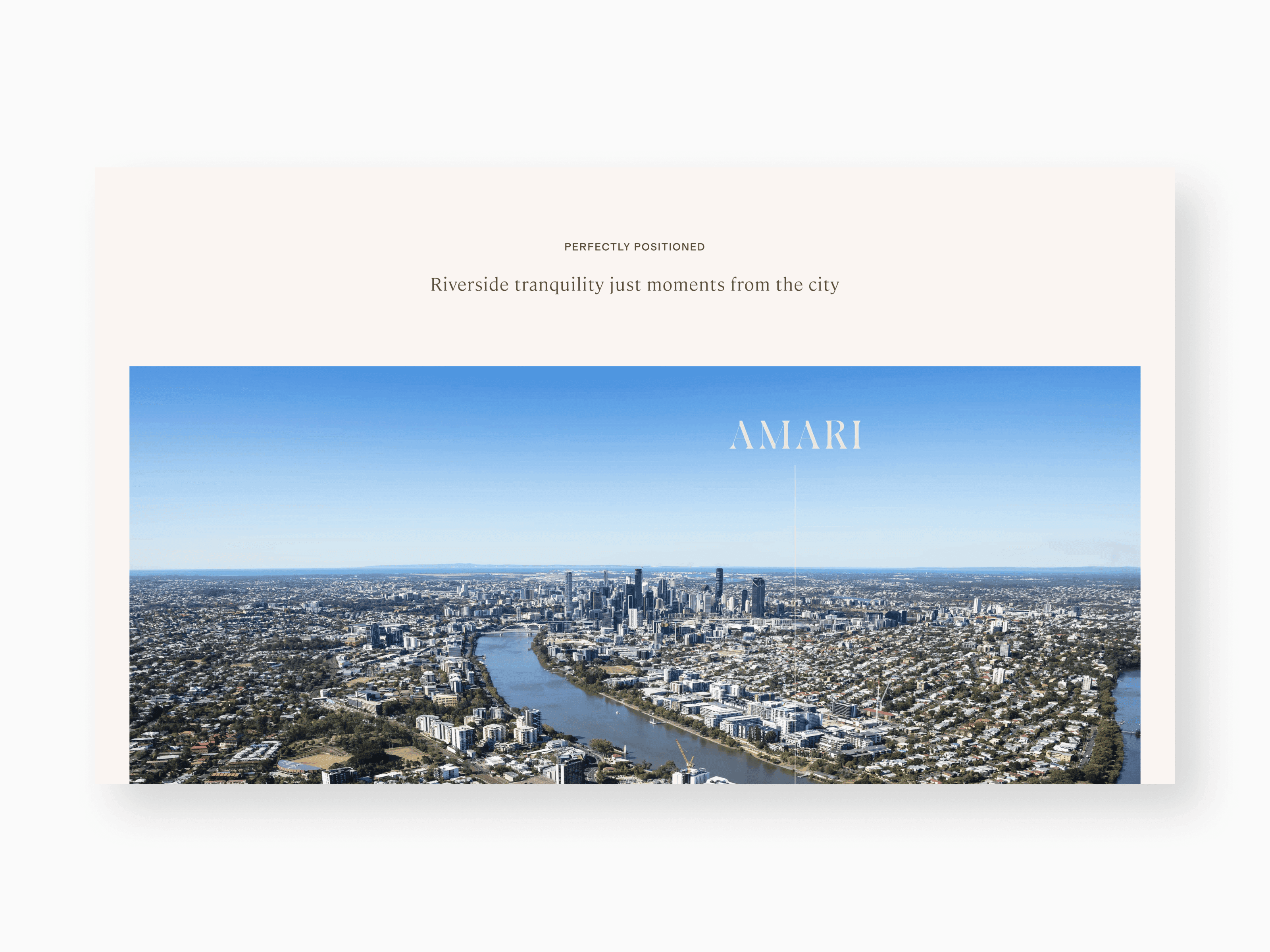 Inspired by the curves of the Brisbane River, AMARI consists of 28 sculpted luxury residences. I designed an atmospheric waitlist page that pairs nature-inspired branding with aerial location storytelling. The interface leverages the developer's award-winning reputation to secure qualified leads before the official market debut.