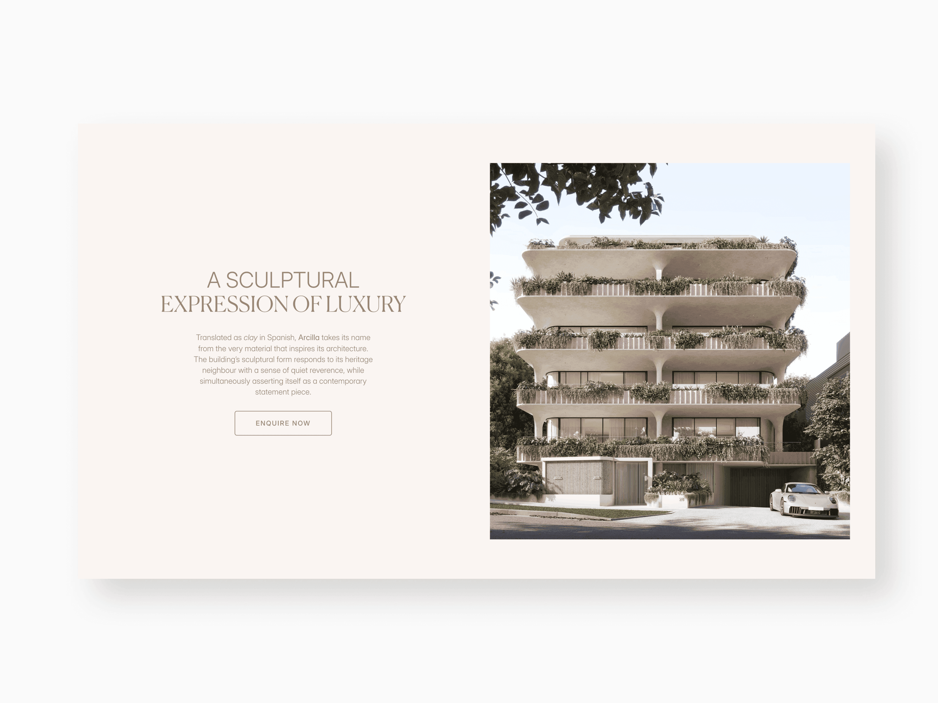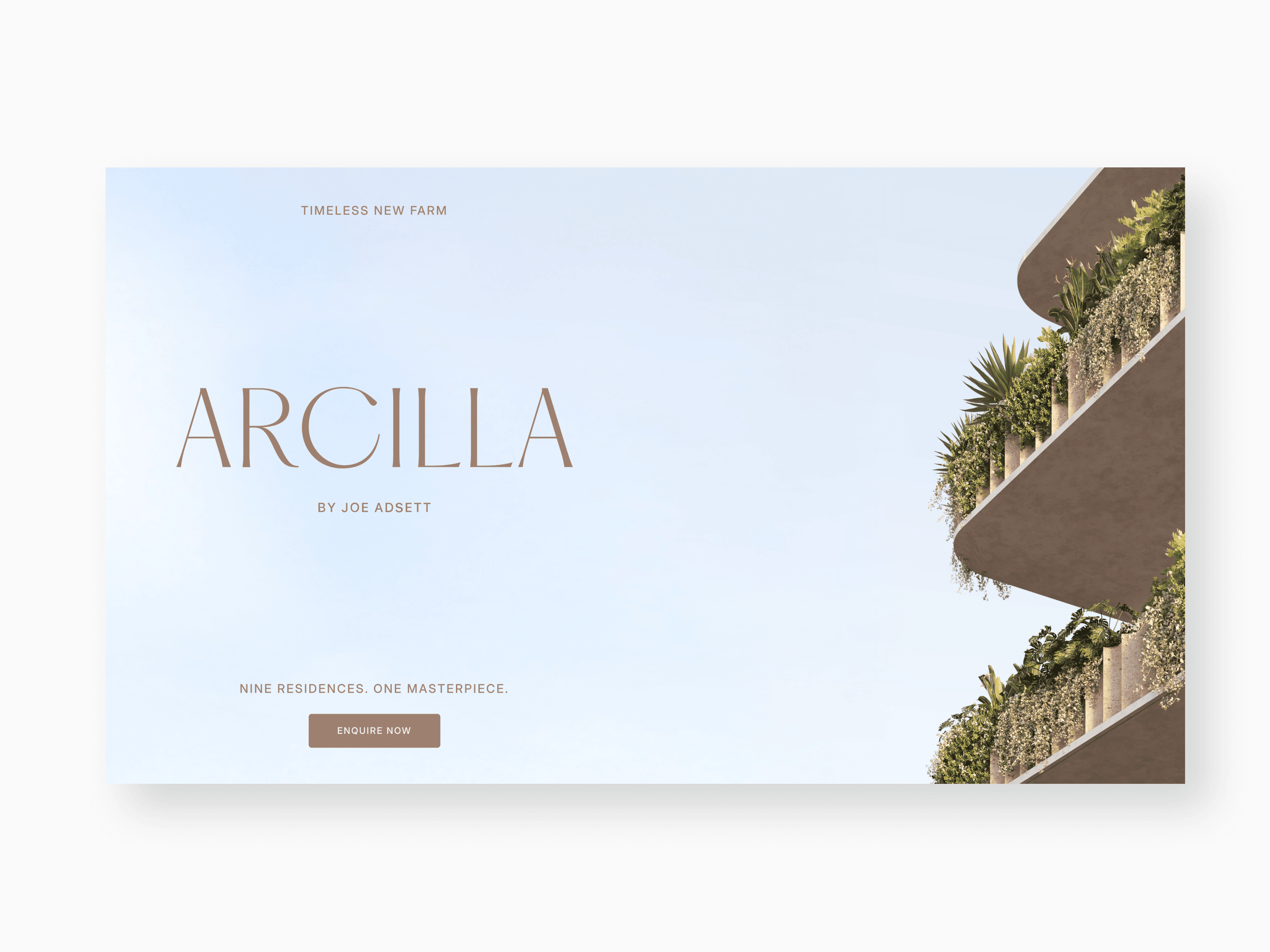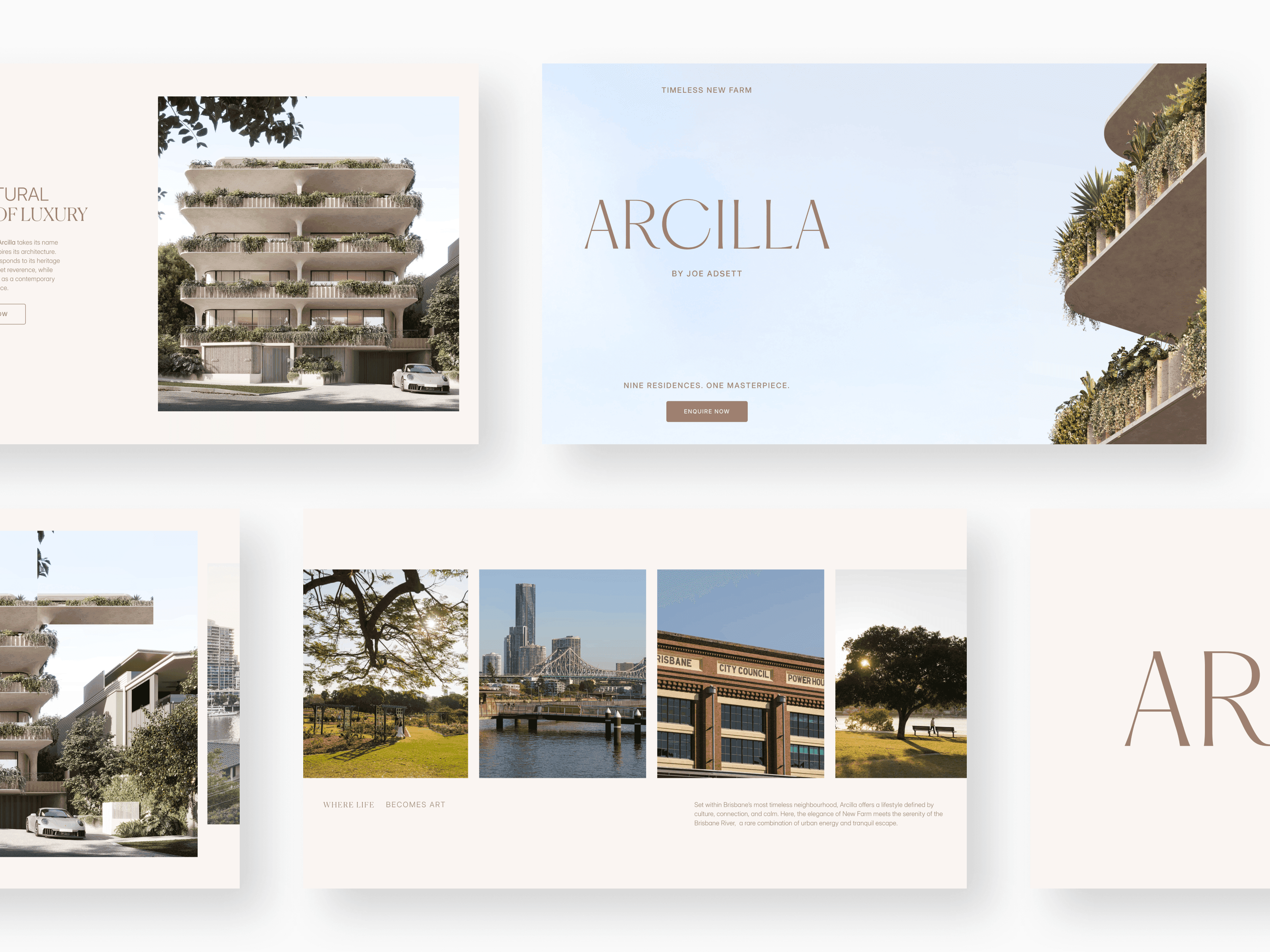 Arcilla is a boutique collection of nine residences in New Farm, designed as a sculptural expression of luxury. I designed a digital experience for Joe Adsett Developments that treats architecture as art. The site uses immersive terrace visualizations and neighborhood galleries to position the project as a landmark, limited-edition release.