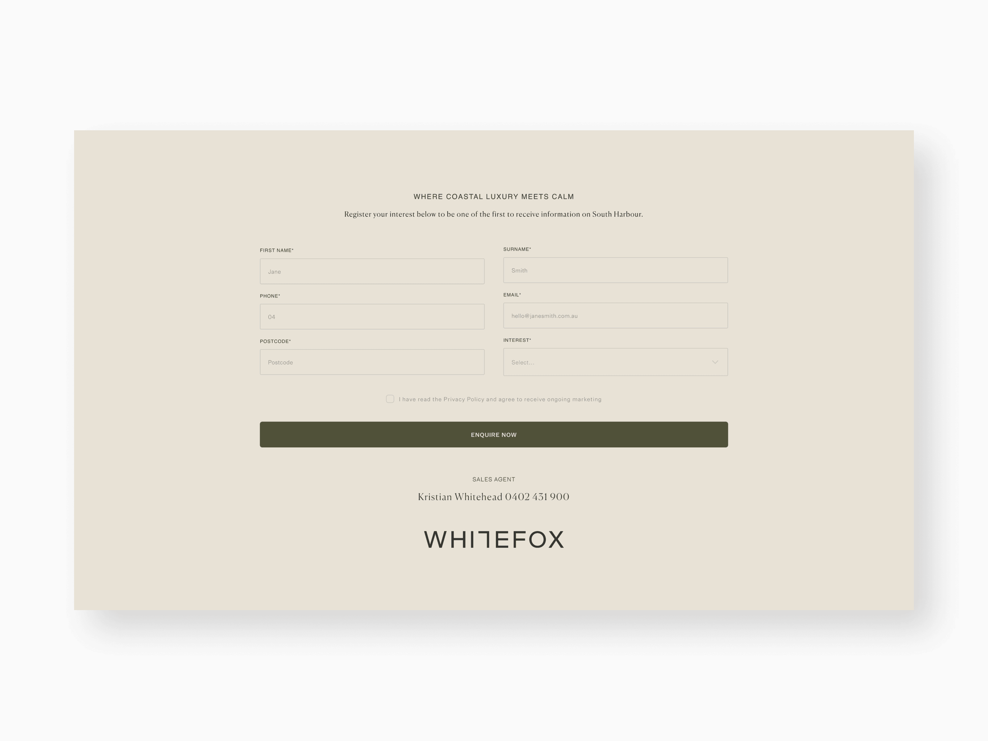 South Harbour is an exclusive collection of 22 luxury homes on the Hervey Bay Esplanade. I designed a high-end, minimalist waitlist page to capture interest and build a database ahead of the official launch. The experience focuses on atmospheric coastal imagery and a singular "Enquire Now" architecture to maximize pre-launch conversions.