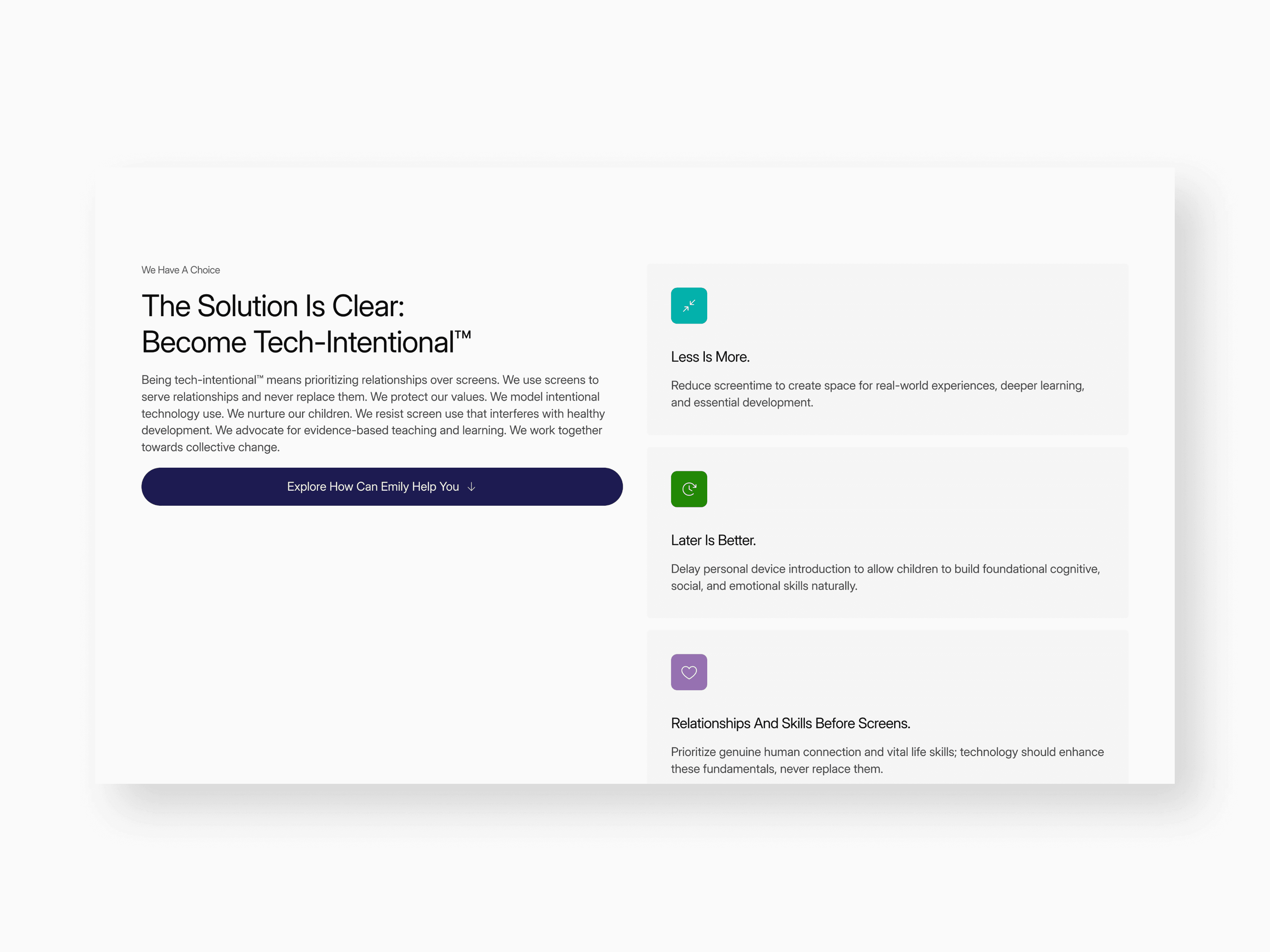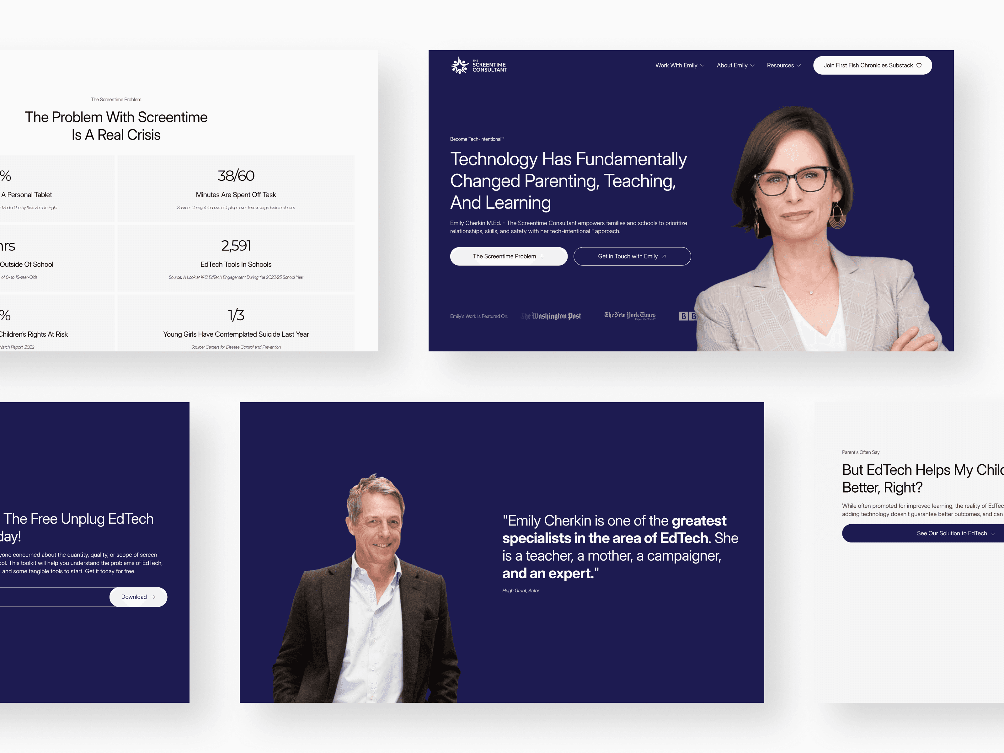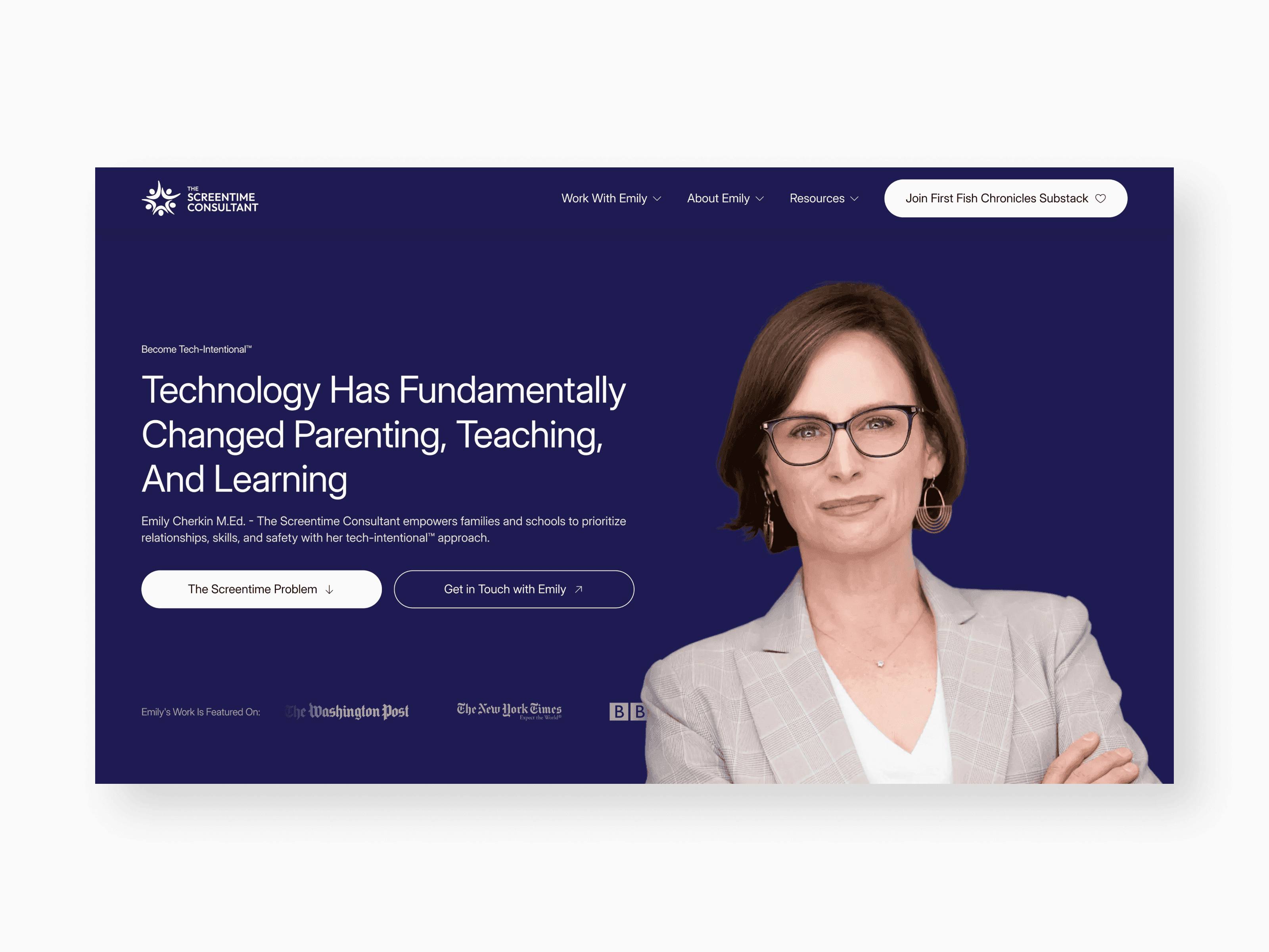 Emily Cherkin, M.Ed., is a nationally recognized expert in digital health. The mission was to design a comprehensive website that balances her roles as a professional speaker, bestselling author, and policy advocate. The interface uses custom data visualizations and resource toolkits to present high-stakes research in an approachable, judgment-free way.