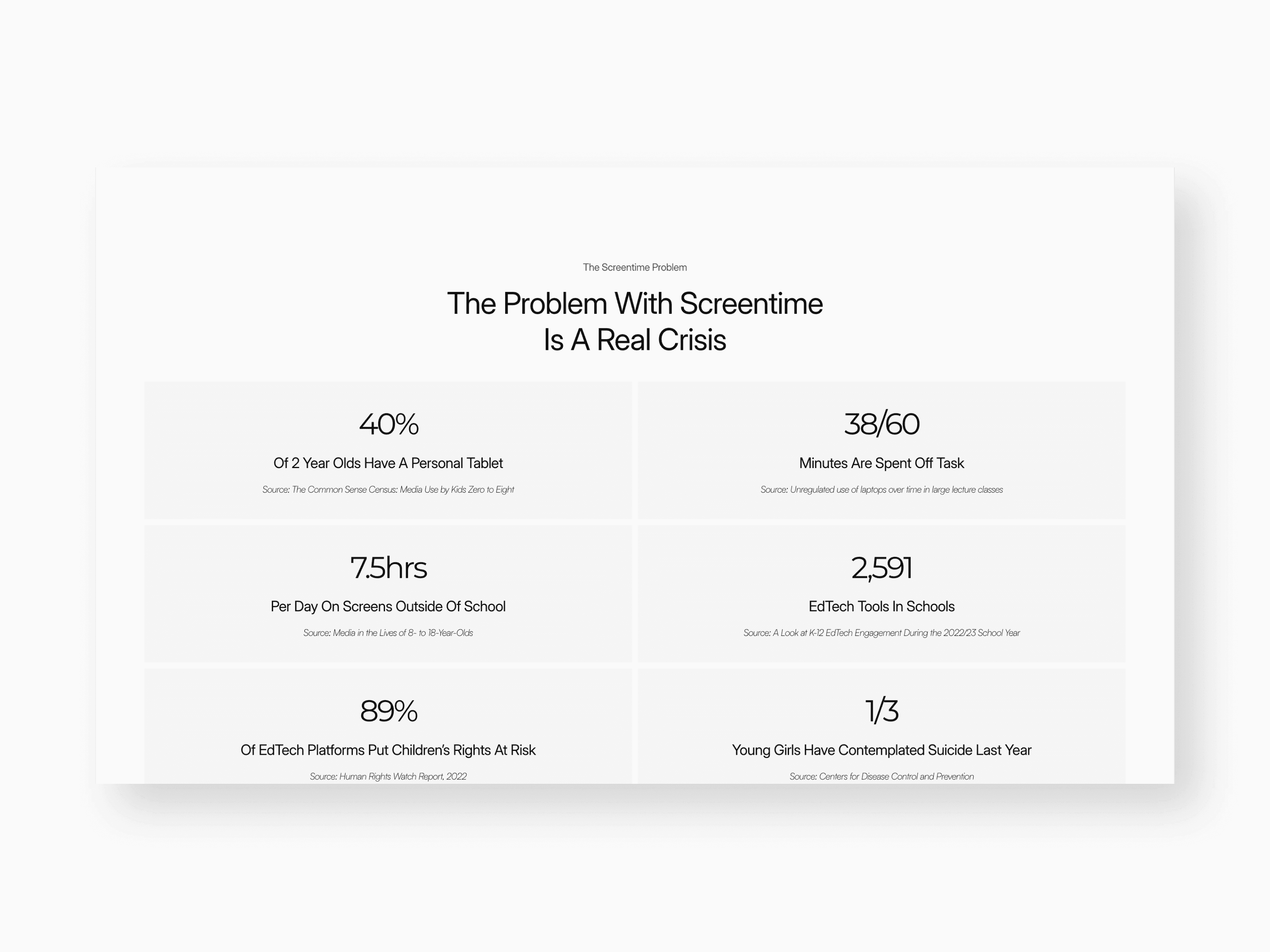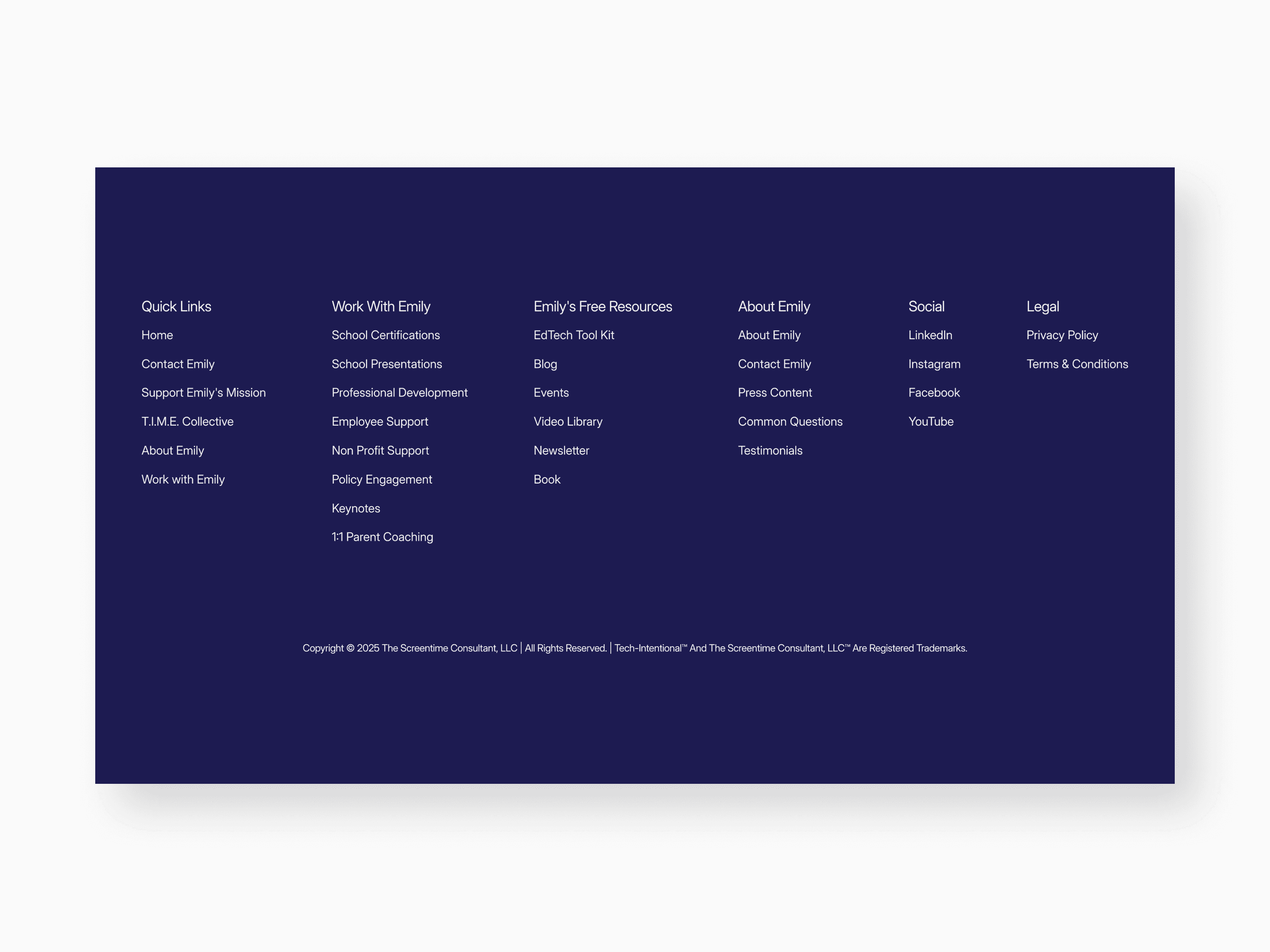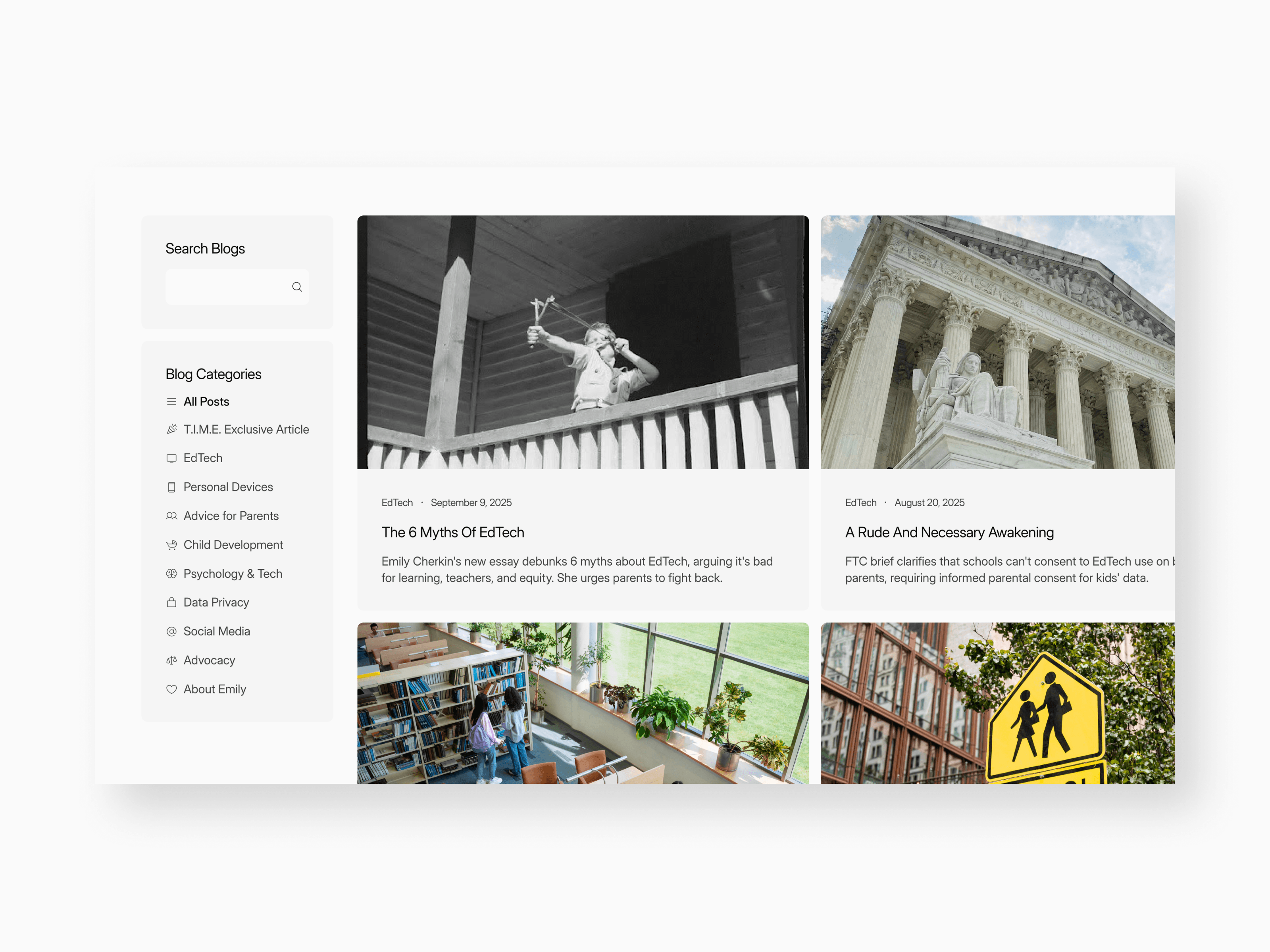 Emily Cherkin, M.Ed., is a nationally recognized expert in digital health. The mission was to design a comprehensive website that balances her roles as a professional speaker, bestselling author, and policy advocate. The interface uses custom data visualizations and resource toolkits to present high-stakes research in an approachable, judgment-free way.